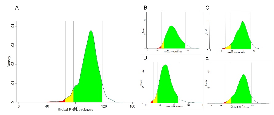 图示全周(A)以及颞侧(B)、上方(C)、鼻侧(D)、下方(E)象限pRNFLT绿色表示厚度处于5%~95%区间,黄色为1%~5%区间,红色为<1%