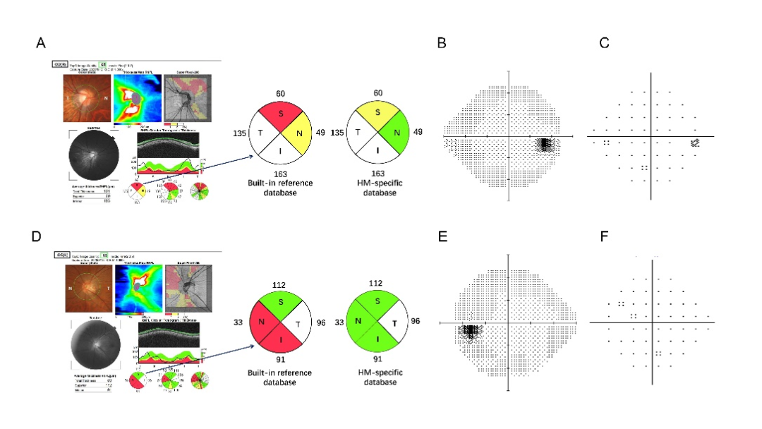 A-C、D-F:两例高度近视非青光眼患者的OCT报告及视野报告;机器数据库提示红色为RNFL缺损,而经新开发的数据库提示RNFL厚度处于正常范围之内