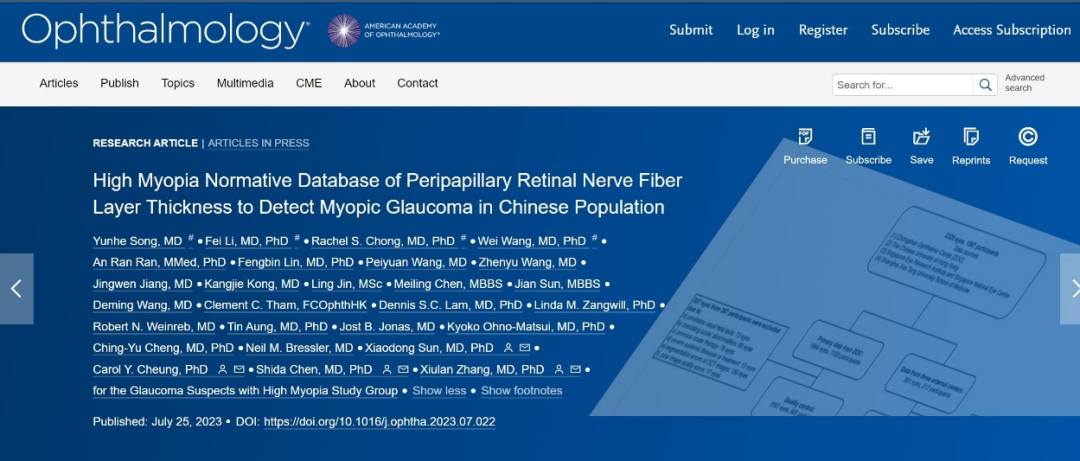 2023年7月25日,国际眼科排名第一的期刊《Ophthalmology》在线发表了raybet官网登录入口张秀兰教授团队关于高度近视眼盘周神经纤维层厚度(pRNFLT)标准数据库建立用于诊断和鉴别诊断高度近视合并青光眼的原创性论著High Myopia Normative Database of Peripapillary Retinal Nerve Fiber Layer Thickness to Detect Myopic Glaucoma in Chinese Population 。这是该团队自2021年8月至今在《Ophthalmology》杂志上发表的第五篇原创长文论著。