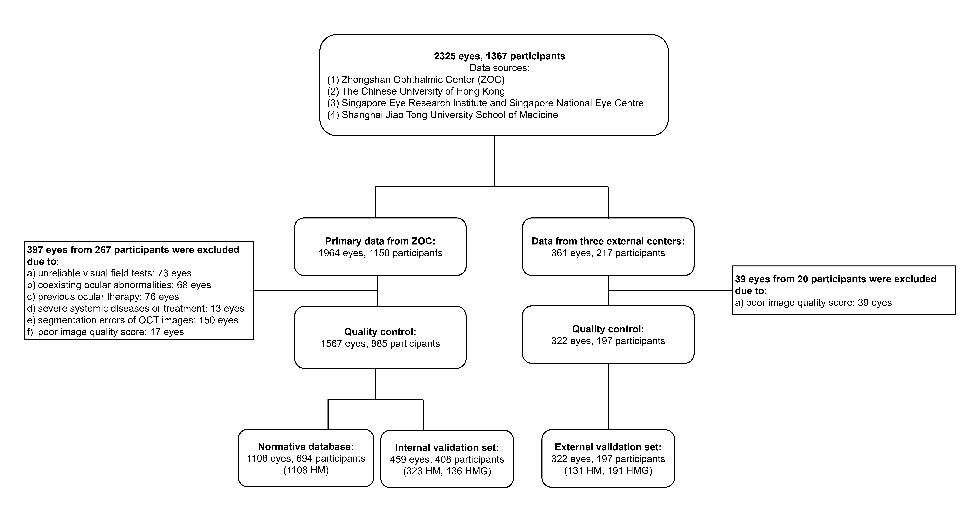 本研究从团队建立的1634人的高度近视合并青光眼(Glaucoma Suspects with High Myopia,GSHM)队列中选取符合本研究条件的1367人(2325眼),进一步遴选出1150人(1964眼)进行研究,经过严格质量控制、图像清洗和筛选,最终筛选出894人(1108眼)建立高度近视pRNFLT标准数据库(见下图2)。接着,在来自雷竞技最新版下载的内部验证集(459眼),和来自中国上海、中国香港和新加坡数据组成的外部验证集(322眼)中对比该数据库和OCT内置数据库的诊断效能(见下图3流程图)。当使用第5百分位数作为cutoff值时,高度近视专用数据库诊断准确率可达0.93(内部验证)和0.85(外部验证),均显著高于OCT机器内置数据库(p均<0.05),其敏感性达0.75,特异性近乎1.00,有效减少高度近视合并青光眼诊断的假阳性率(见下图4示例)。本研究首次定义了亚洲范围内中国人高度近视pRNFLT参考值范围,为临床医生使用光学相干断层扫描(OCT)鉴别高度近视与青光眼提供了重要的参考指标。
