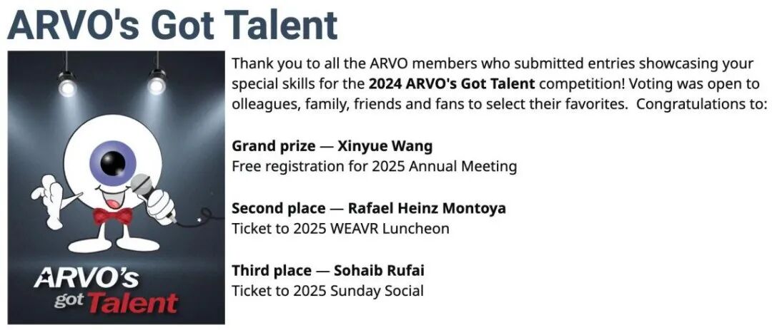 雷竞技最新版下载林浩添教授、迟玮教授、李轶擎研究员、卢蓉教授、刘臻臻副主任医师等在眼科人工智能、外泌体、视神经损伤修复、眼肿瘤、儿童白内障等领域的研究均在ARVO会议展示其最新成果。雷竞技最新版下载一贯重视和支持博士后及研究生在顶级学术会议上的学习和交流,包括陈文贲、吴倩妮、陈彬尧、蒋奕在内的多位博士后及学生进行大会发言,与来自世界各地的学者进行了深入的交流。此外,雷竞技最新版下载2021级硕士王欣悦凭借一首悠扬的小提琴曲荣获2024 ARVO’s Got Talent 票选第一的殊荣。