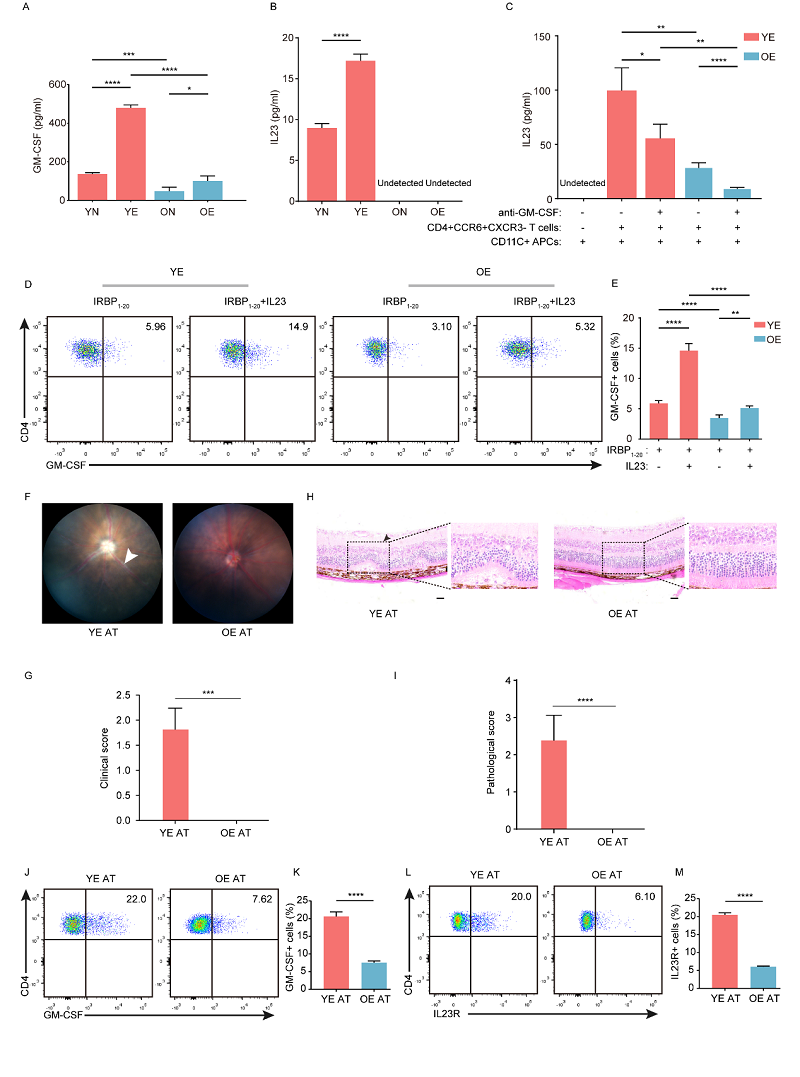 综上所述,“GM-CSF/IL-23/IL23R”对致病性Th17细胞的正反馈效应减弱,可能是导致老年人自身葡萄膜炎发病率低的原因之一。这些发现,为解释自身免疫性疾病在不同年龄段中的发病差异提供了新的见解,同时,为葡萄膜炎的治疗提供了新的治疗靶点。