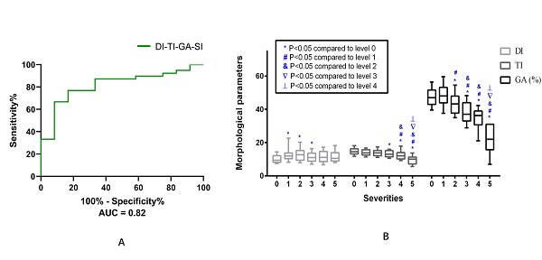 团队进一步研究了不同严重程度MGD中上述参数的等级变化规律,发现形变指数(DI)在轻中度MGD中显著升高,与早期睑板腺开口阻塞,睑脂堆积导致局部扩张、以及局部腺泡少量萎缩有关,可作为轻度MGD的判断指标;而扭曲系数(TI)在中重度MGD中明显下降,并且伴随有腺体面积比(GA)减少,反应弥漫性重度腺泡萎缩。基于腺体不同形态学指标在不同严重度MGD中的特征规律,课题组提出了基于睑板腺形态学细节(TI-DI-GA)的MGD分级模型,在各级别MGD中分级准确率AUC达0.79~1.0,为临床进行MGD分级提供了新的标准。