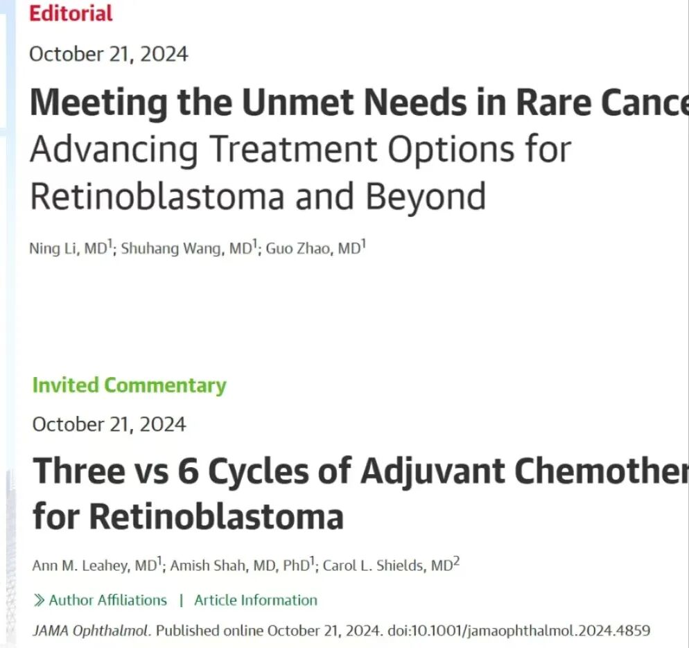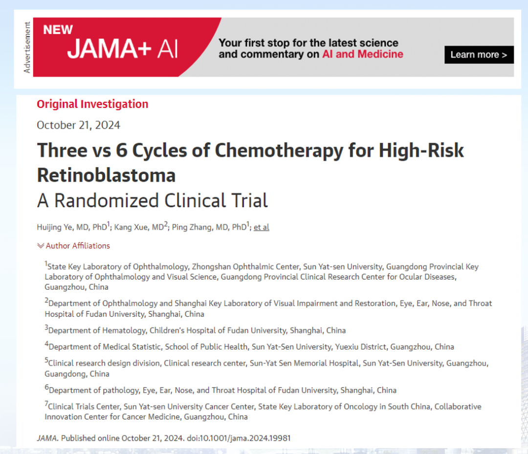 2024年10月21日,raybet官网登录入口杨华胜教授团队联合复旦大学附属眼耳鼻喉科医院钱江教授团队在国际顶尖医学期刊JAMA发表了题为“Three vs 6 Cycles of Chemotherapy for High-Risk Retinoblastoma :A Randomized Clinical Trial”的研究论文。这项研究是raybet官网登录入口在JAMA上的第二篇原创临床研究论文,也是我国眼科领域在该期刊发表的第二篇临床研究论著。