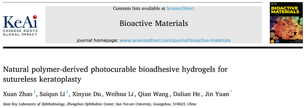 2021年7月6日,raybet官网登录入口为唯一单位,袁进教授作为唯一通讯作者,赵轩博士后和李赛群副主任医师为共同第一作者在Bioactive Materials(Available online 6 July 2021,工程技术Top期刊,中科院一区,影响因子14.593)发表题为“Natural Polymer-Derived Photocurable Bioadhesive Hydrogels for Sutureless Keratoplasty”的研究论文。该工作研发了一种由甲基丙烯酰化明胶(GelMA)和氧化葡聚糖(ODex)组成的光固化生物粘合性水凝胶。该新型生物粘合剂具备良好的光学透明性、组织粘附性和细胞生物相容性,实现了无损伤、无缝线原位固定板层角膜植片,为眼科和外科手术的组织固定提供了新的思路。这也是该团队继“纳米复合型生物载药角膜接触镜(ACS Nano 2016)”、“化学结枝修饰生物活性羊膜(Frontiers in Bioengineering and Biotechnology 2020)”之后又一重要成果。