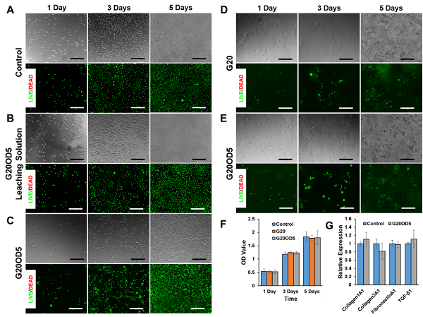 通过平面培养和三维立体培养的体外细胞实验证明,该粘合体系无细胞毒性且不会引起角膜基质纤维细胞的转型,导致额外的角膜基质瘢痕反应(图3)。