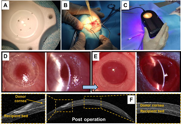 该团队研发的光固化生物粘合性水凝胶,具有高透光率、耐酶解和优异的生物相容性,以及更高的粘附强度,新型凝胶的光固化特性为手术医生进行手术设计规划提供了便捷可操作性,实现角膜植片的原位无缝线固定。