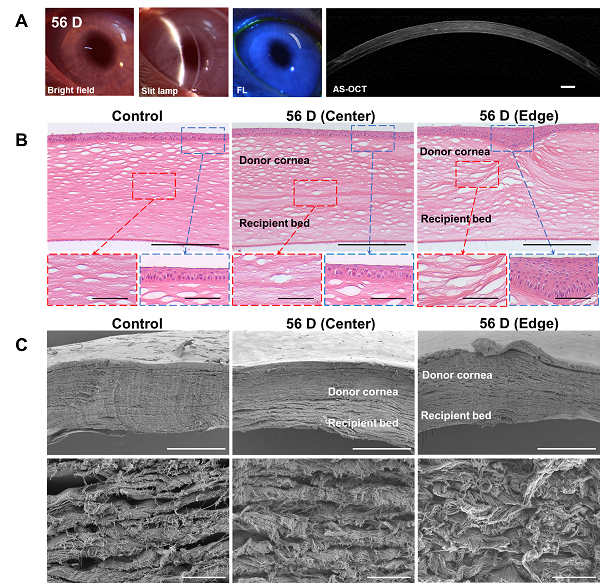 采用该生物粘合剂替代传统缝线固定,角膜植片与角膜植床贴附良好,裂隙灯显微镜和眼前段OCT均显示移植后角膜保持良好光学透明性和表面弧度。H&E染色的显示术后56天角膜上皮层已恢复正常厚度,未观察到炎症细胞。结合电镜显示角膜基质层结构正常,受体与供体整合良好,粘合剂的缓慢降解特性完美匹配于植片-植床愈合规律(图5)。